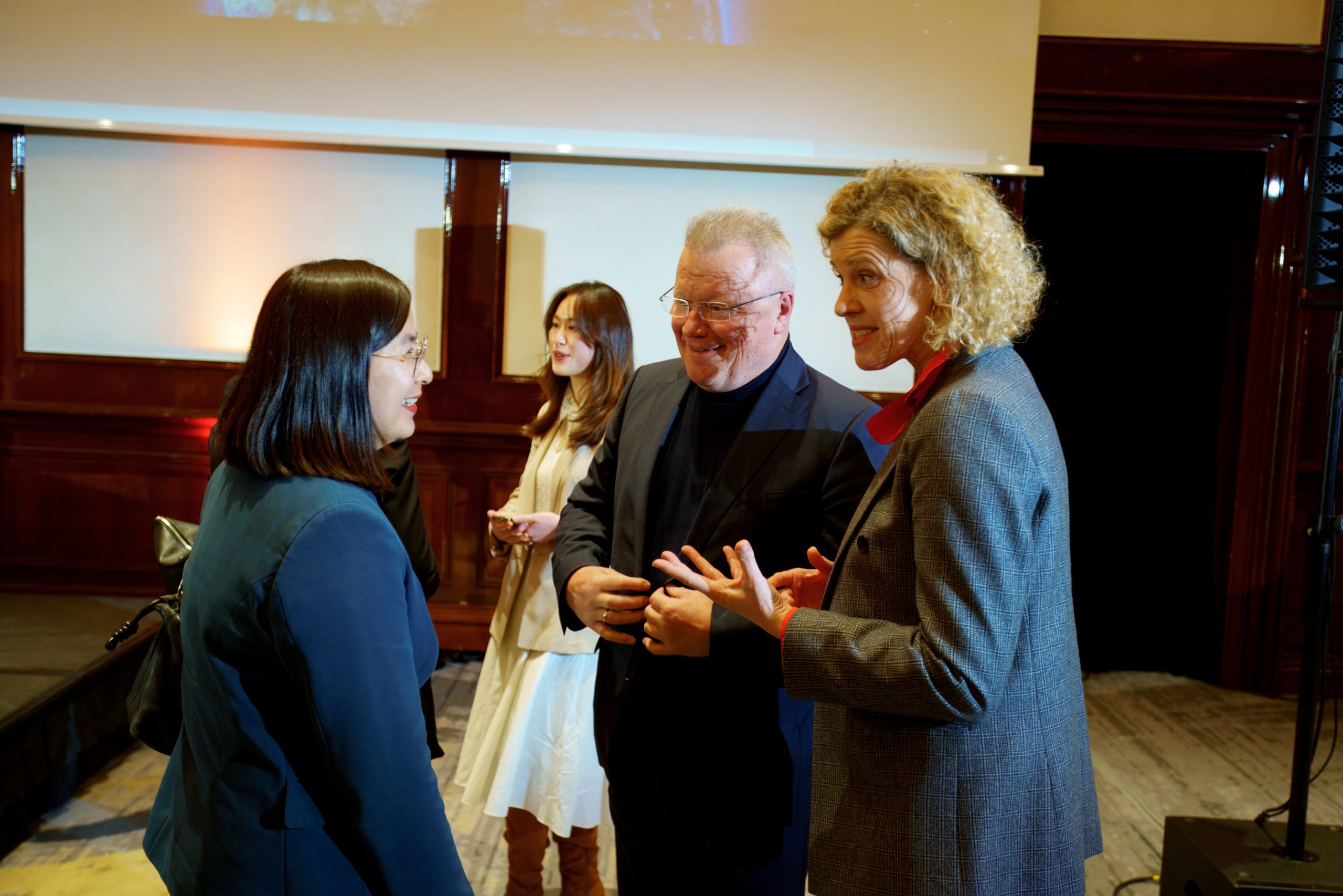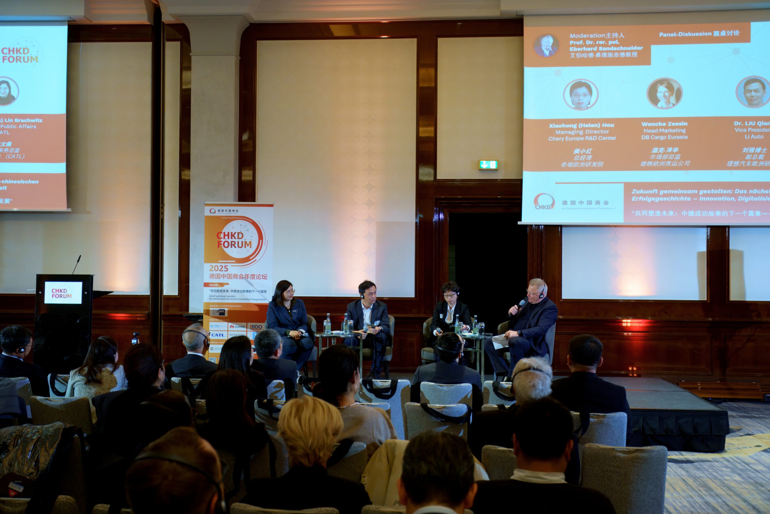Die anschließende Podiumsdiskussion moderierte der renommierte China-Experte Professor Dr. Eberhard Sandschneider. Teilnehmende waren Hou Xiaohong, Geschäftsführerin des Europäischen F&E-Zentrums von Chery, Dr. Liu Qiang, Vizepräsident des Europäischen Forschungsinstituts von Li Auto, sowie Wenpei (Viola) Lin Brachwitz, Director Public Affairs von CATL. Unter dem Thema „Digitalisierung, Automobilindustrie, Energie und Konsum“ diskutierten die Experten über industrielle Transformation, technologische Innovation sowie Markttrends. Praxisbeispiele aus den Bereichen intelligente Mobilität, erneuerbare Energien, Logistik und Lieferketten sowie Konsumtrends verdeutlichten die vielfältigen Potenziale für vertiefte Kooperationen und gemeinsame Innovationsprojekte.