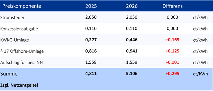 Preiskomponenten Strom 2025 und 2026 im Vergleich, ohne Berücksichtigung von Reduzierungsanträgen: