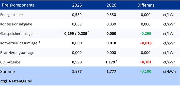 Im Erdgas fällt durch Änderung des EnWG die Gasspeicherumlage weg, dafür steigen die CO2-Abgaben (s. 3. Nachhaltigkeit) und die Konvertierungsumlage.
